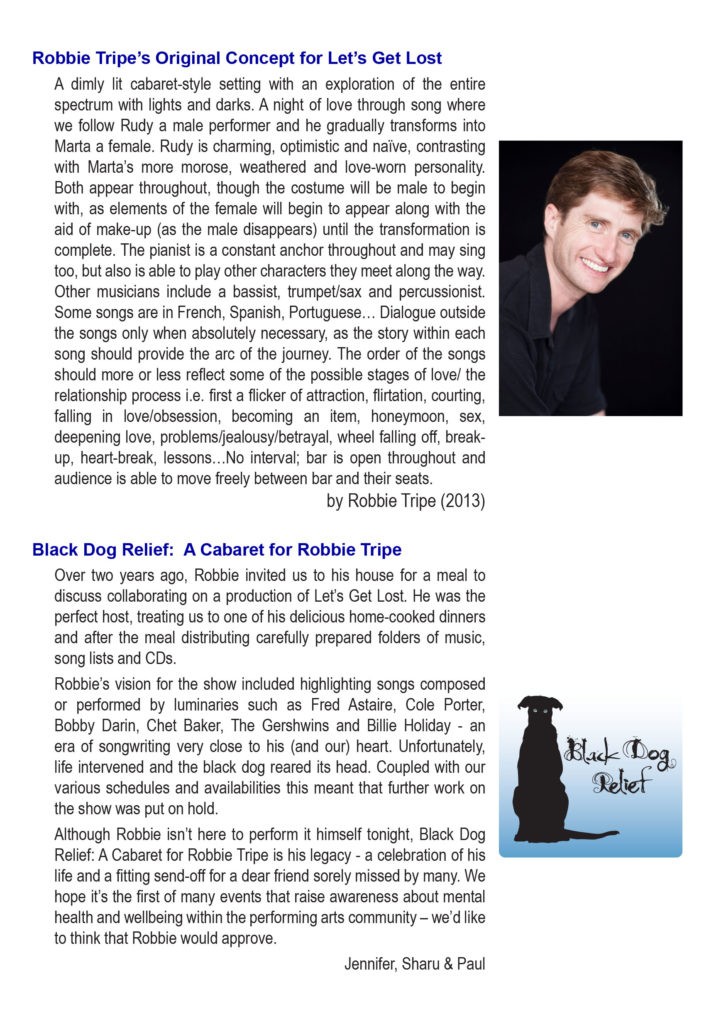 The cabaret show Black Dog Relief – A Cabaret for Robbie Tripe brings emerging and established actor/singers together for a one night only performance, to honour a talented member of the performing fraternity who left us after losing the battle with the Black Dog.